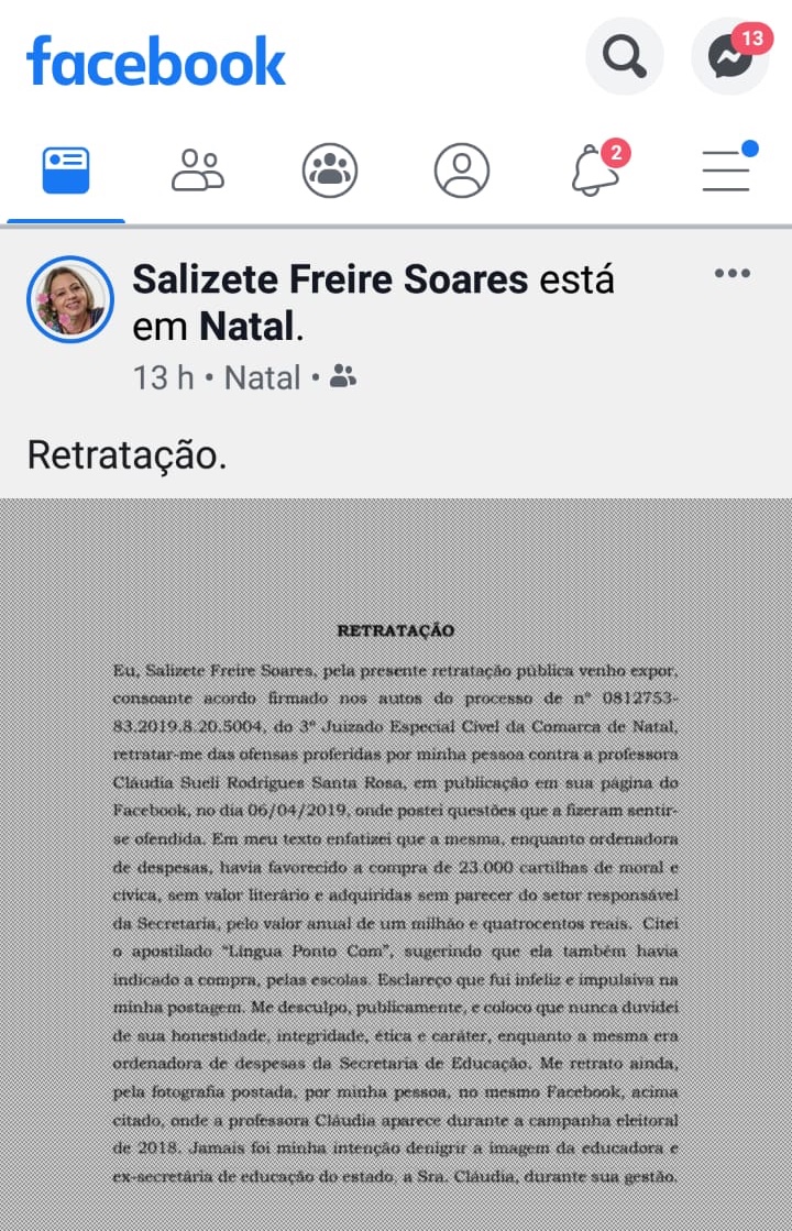 Compartilho imagens de uma postagem no Facebook e de publicação no Jornal Tribuna do Norte para conhecimento de vocês que me acompanham e defendem a decência na gestão pública. Precisei ir à Justiça porque, no mês de abril do corrente ano, fui alvo de duras ofensas e acusações, mesmo tendo deixado o cargo de Secretária … Continue lendo RETRATAÇÃO PÚBLICA A MEU FAVOR