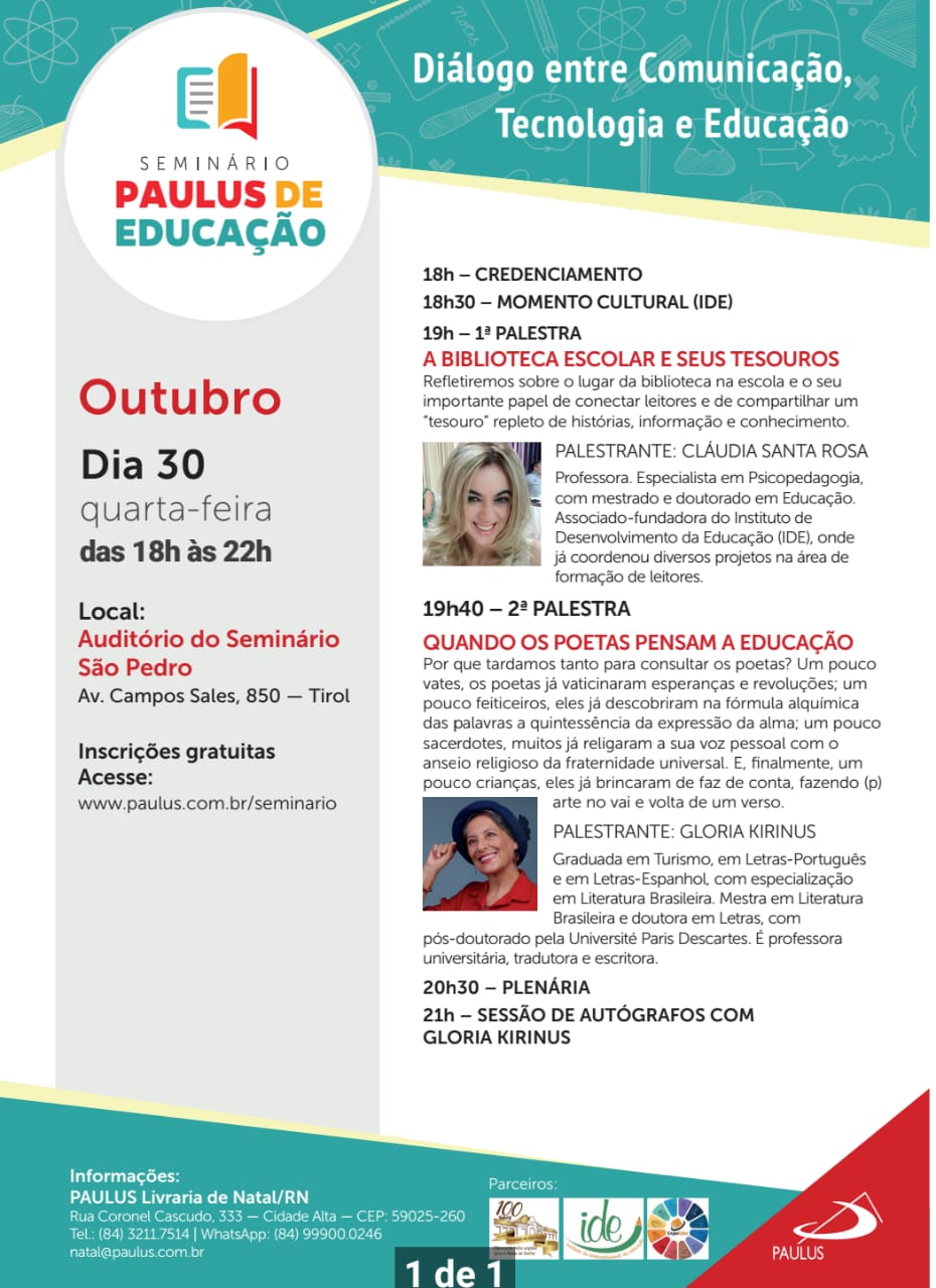 Quem puder, espalhe! Evento bacana. Honrada com o convite da Editora Paulus para realizar palestra sobre um tema que me acompanha já faz alguns anos. Reencontrar a querida e competente escritora Glória Kirinus fará do Seminário um momento de celebração. Evento gratuito com direito a certificado de participação, mas que requer inscrições antecipadas pelo (84) … Continue lendo Seminário para quem ama a leitura