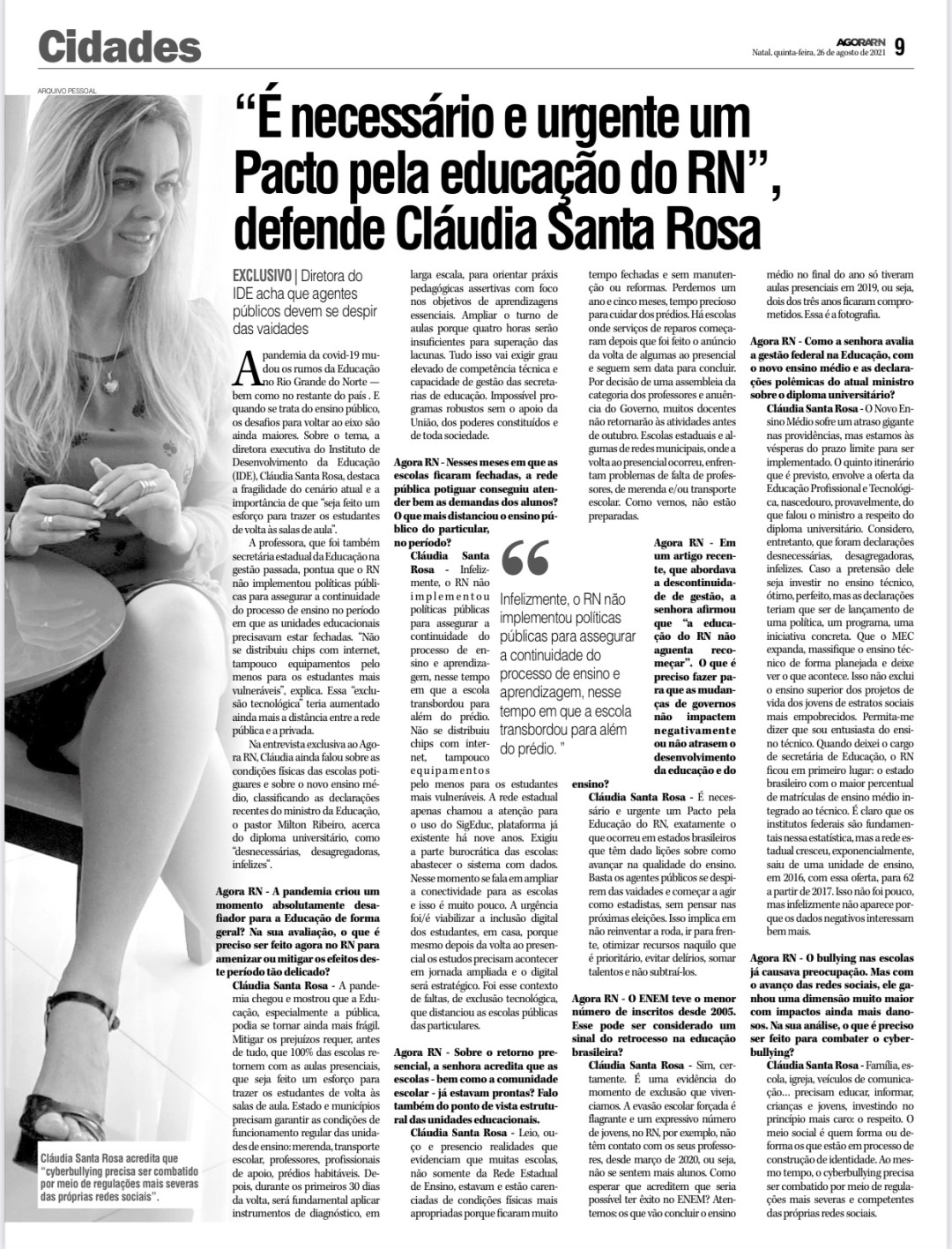 Diretora do IDE acha que agentes públicos devem se despir das vaidades A pandemia da covid-19 mudou os rumos da Educação no Rio Grande do Norte — bem como no restante do país . E quando se trata do ensino público, os desafios para voltar ao eixo são ainda maiores. Sobre o tema, a diretora … Continue lendo “É necessário e urgente um pacto pela educação do RN”, defende Cláudia Santa Rosa