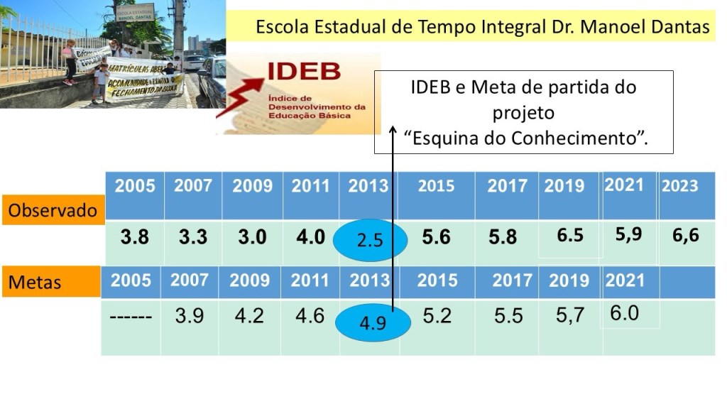 Entretanto, realçamos a trajetória vitoriosa da Escola Estadual de Tempo Integral Dr. Manoel Dantas que foi fechada em 2014, há 10 anos, com um IDEB 2,5 e menos de 80 alunos, a comunidade lutou, foi reaberta em 2015 com o projeto Esquina do Conhecimento, referenciado em minha tese de doutorado, e alcançou IDEB 5,6 em 2015, 5,8 em 2017, 6,5 em 2019, 5,9 em 2021 e 6,6 em 2023. Hoje é o segundo IDEB mais alto de Natal entre as escolas estaduais e municipais e o 7º de todo estado.