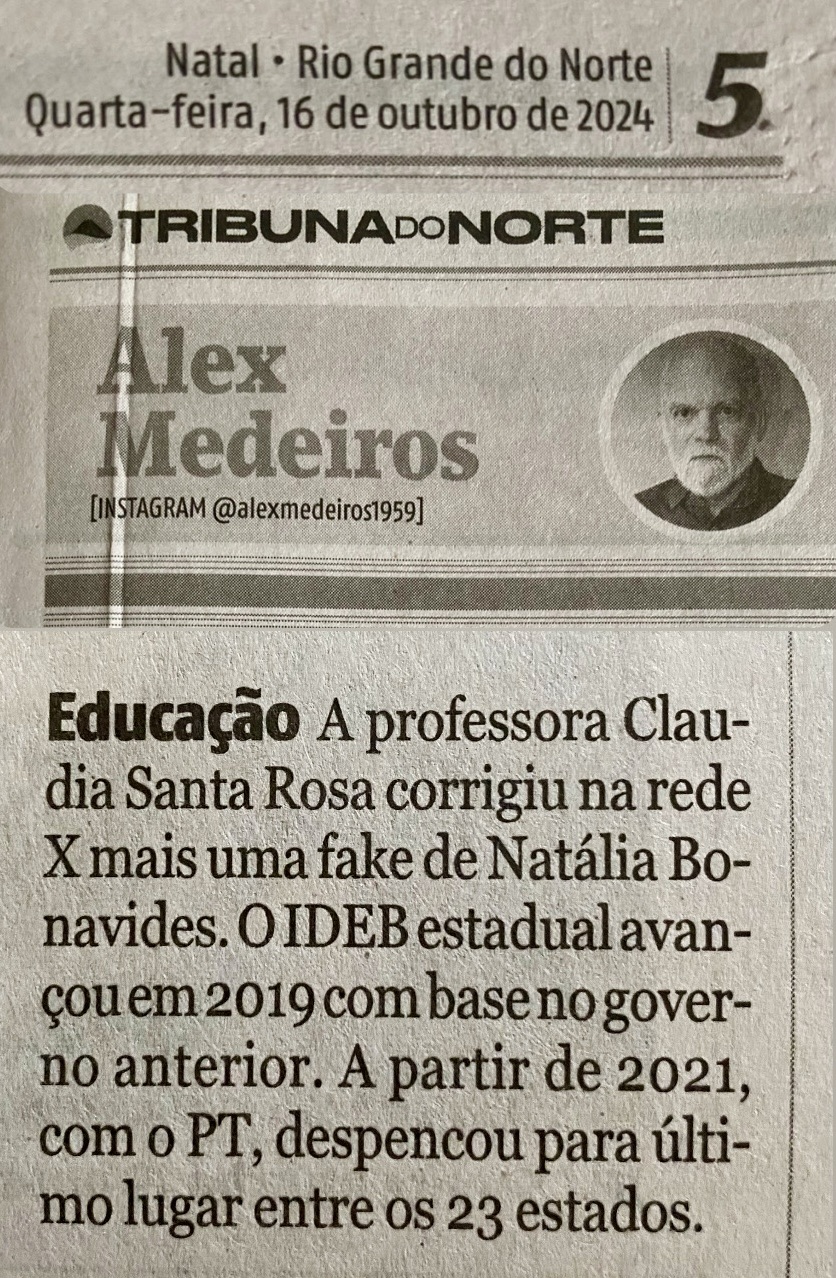No X Twitter, em 14/10/2024, escrevi o seguinte texto, tomando por base declarações da candidata Natália Bonavides: Alguém precisa alertar a candidata Natália sobre o IDEB da rede estadual. Senhora, ocorreu avanço na edição de 2019 que avaliou o Gov anterior. Em 21 despencou e o estado ficou isolado em último lugar. Em 23 todos … Continue lendo Coluna de Alex Medeiros