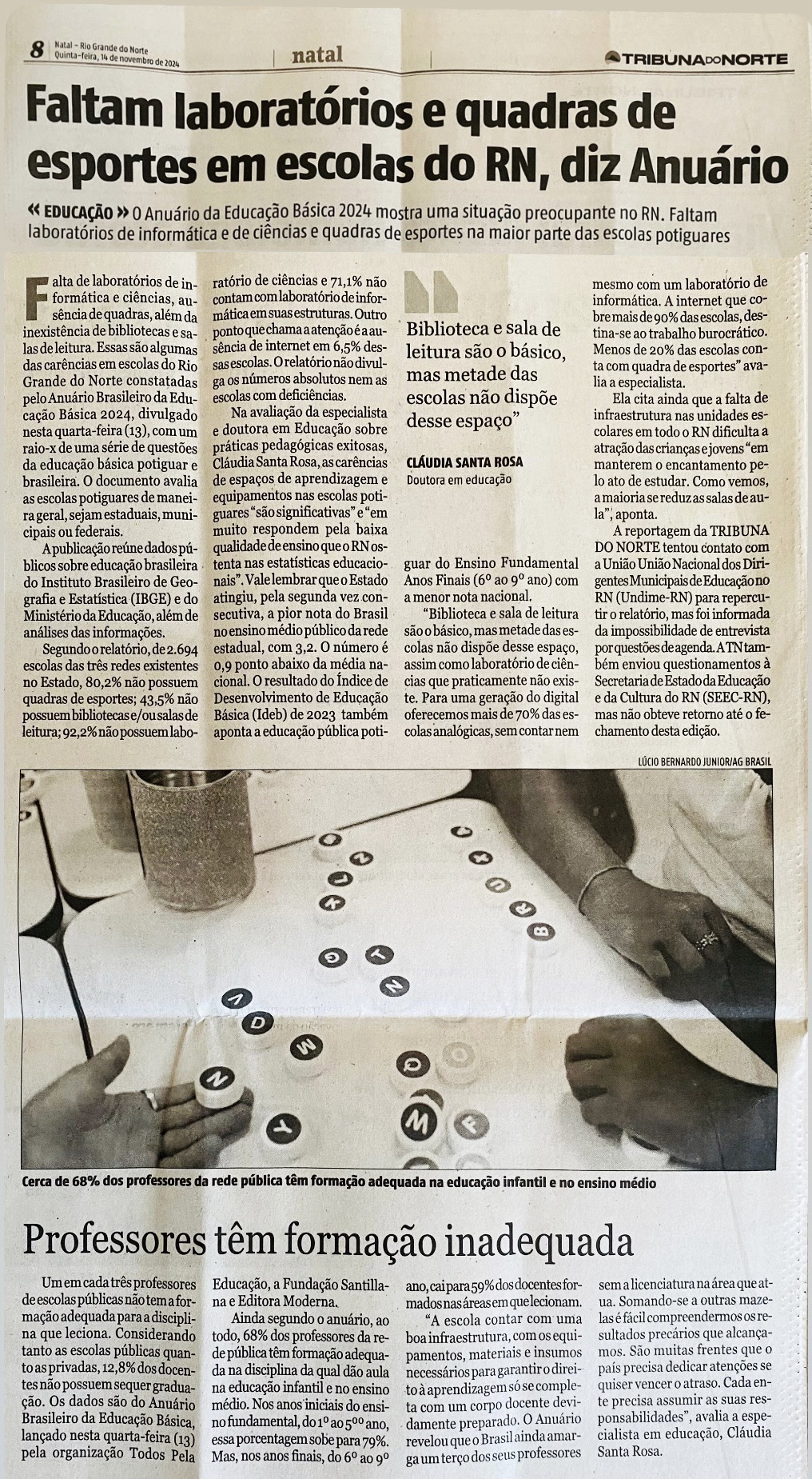 Falta de laboratórios de informática e ciências, ausência de quadras, além da inexistência de bibliotecas e salas de leitura. Essas são algumas das carências em escolas do Rio Grande do Norte constatadas pelo Anuário Brasileiro da Educação Básica 2024, divulgado nesta quarta-feira (13), com um raio-x de uma série de questões da educação básica potiguar … Continue lendo Faltam laboratórios e quadras de esportes em escolas do RN, diz Anuário