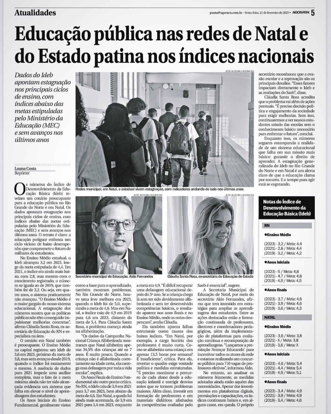 Dados do IDEB apontam estagnação nos principais ciclos de ensino, com índices abaixo das metas estipuladas pelo Ministério da Educação (MEC) e sem avanços nos últimos anos Cláudia: Quando a criança não é alfabetizada corretamente na idade certa, ela carrega essa defasagem por toda a vida escolar”. Foto: Reprodução Os números do Índice de Desenvolvimento … Continue lendo Educação potiguar vive estagnação generalizada e clama por socorro da sociedade